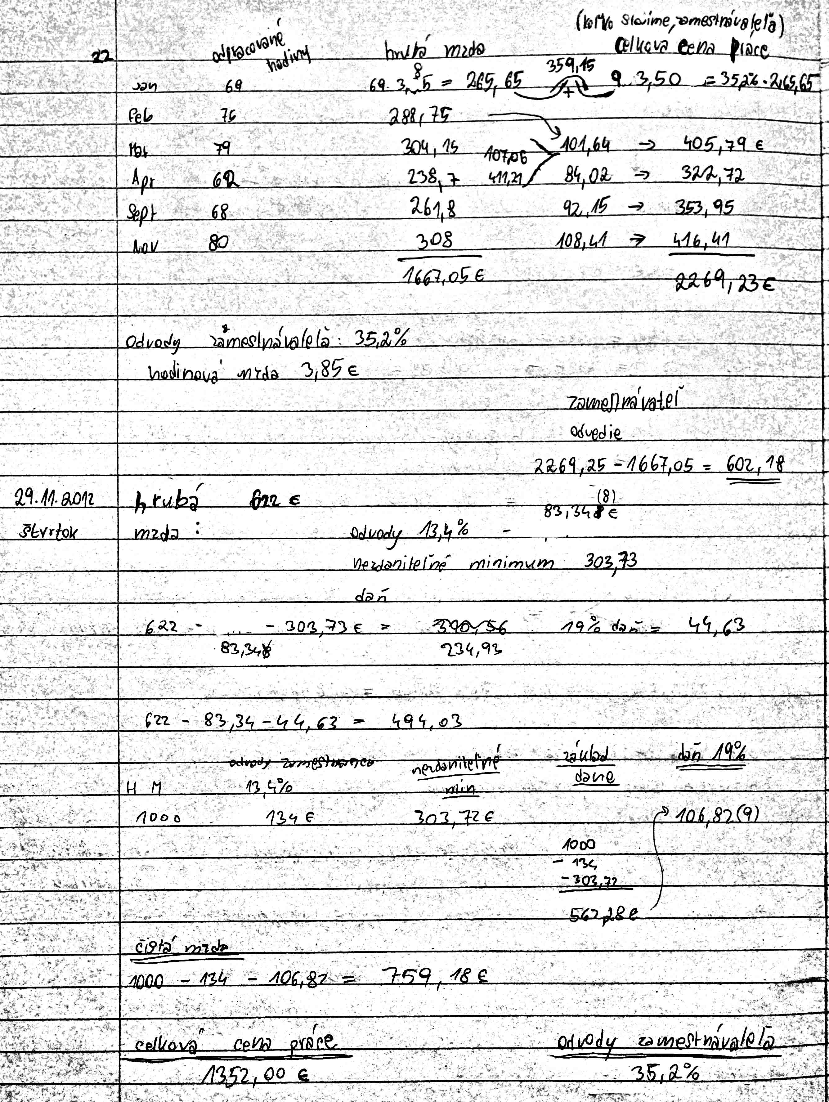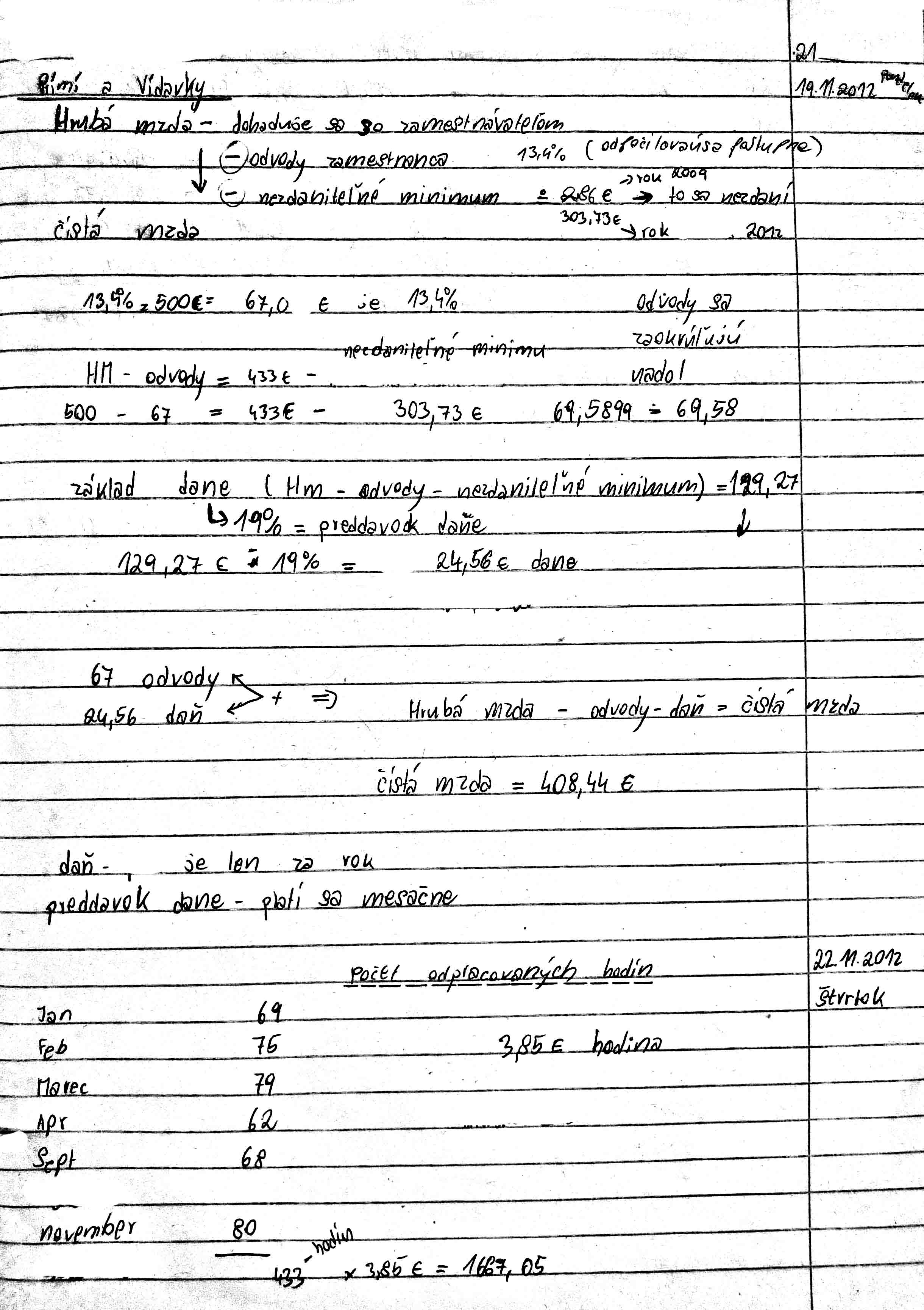 - počet odpracovaných hodín (daň); hrubá -> čístá mzda